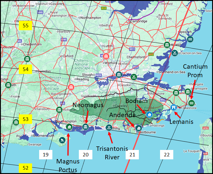 This map shows the Ptolemy Latitudes and Longitudes for the Sussex and Kent areas, the red lines are Roman roads, and the green shaded area shows Andredsweald in the 2nd Century.